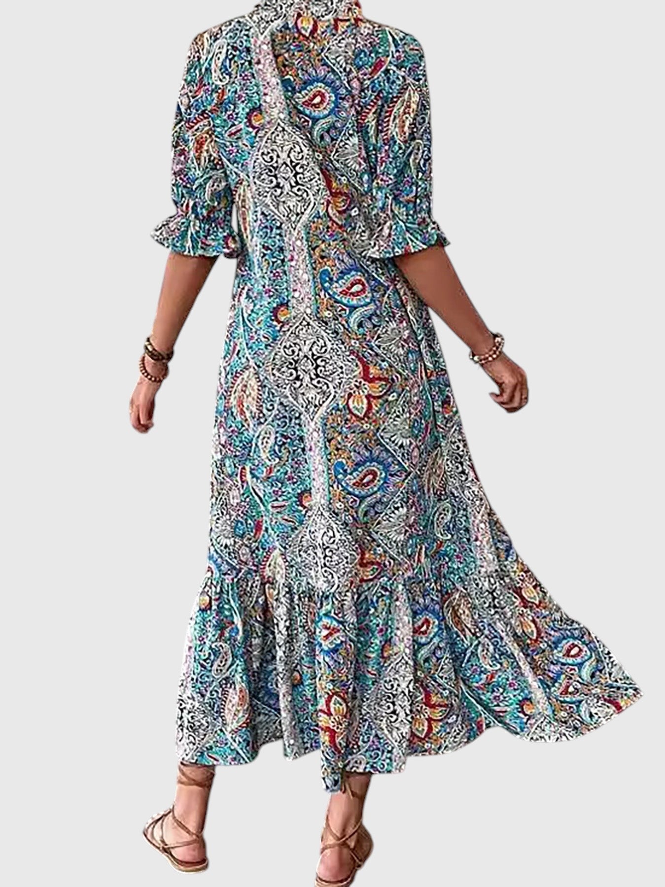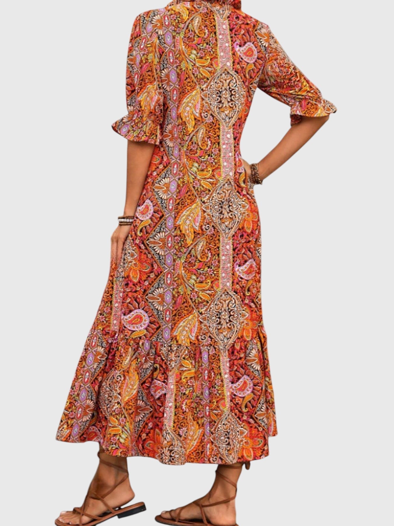 • פרטים אופנתיים: צווארון עומד וקדמת קשירה מוסיפים נגיעה של קסם בוהו.