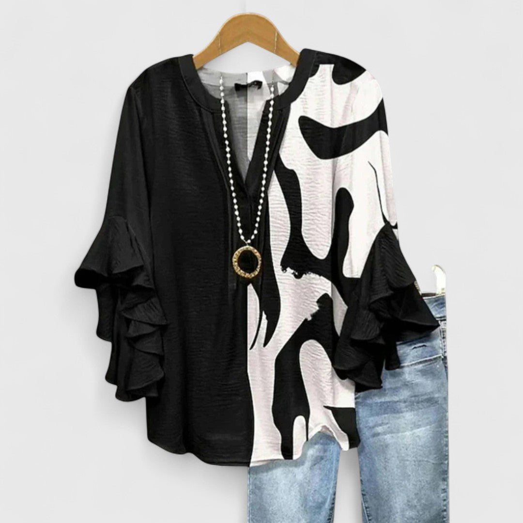 • אלגנטיות ללא מאמץ: הדפס פרחוני מעודן ושרוולים עם קפלים המוסיפים תנועה וקסם.